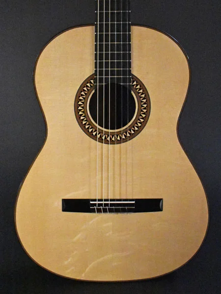 It was a joy to work with the materials that were provided to me by a friend who is an aspiring guitarist, a craftsman and lover of beautiful woods. Although the photography does not do it justice, the African blackwood exhibited a wonderful “birdseye” figure most often seen in hard maple. Not having worked with African blackwood’s bright sapwood as part of the aesthetic scheme before, it was an enjoyable process to shift the book-matched panels on both the headstock and the back to achieve the desired appearance. The aged European spruce top was not only extraordinarily stiff but also had an abundance of a unique random figure which is referred to as “bear claw”. The geometric rosette counterbalances the bearclaw utilizing African ebony, Castello boxwood, American holly and Pacific yew. Precision Rodgers Tuning Machines were manufactured with German silver plates and a custom engraving that recalls the geometry of the rosette.