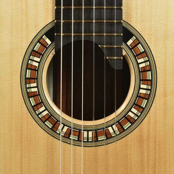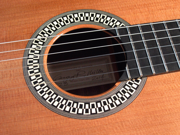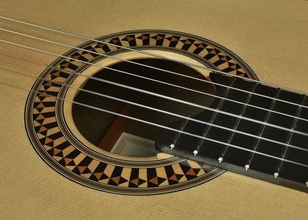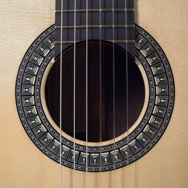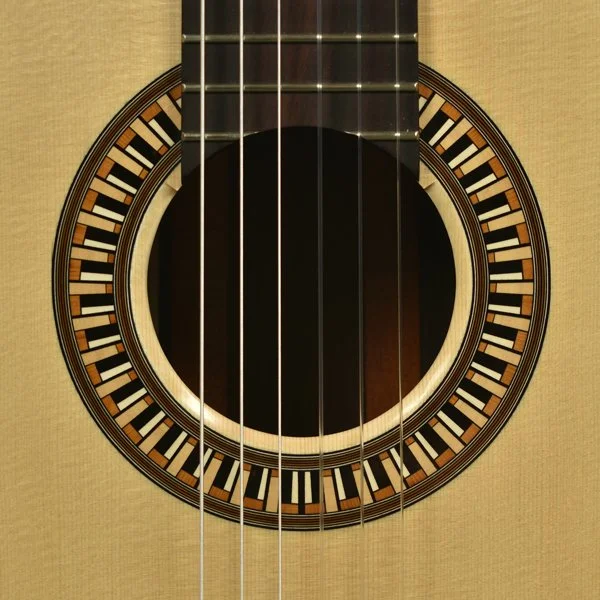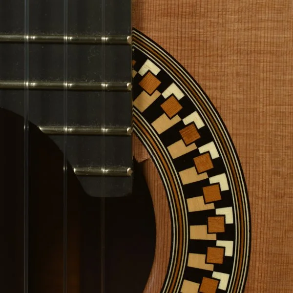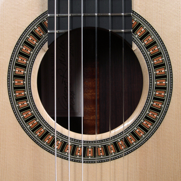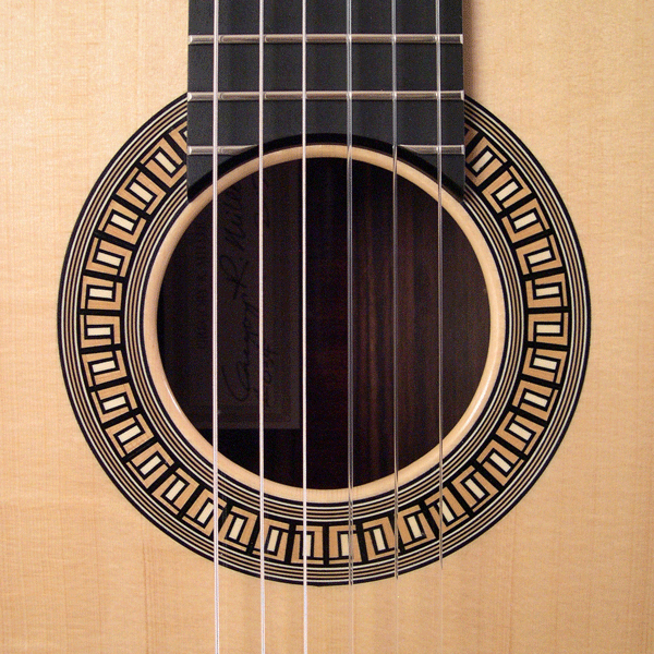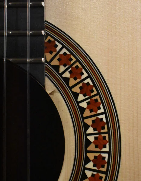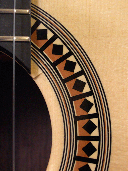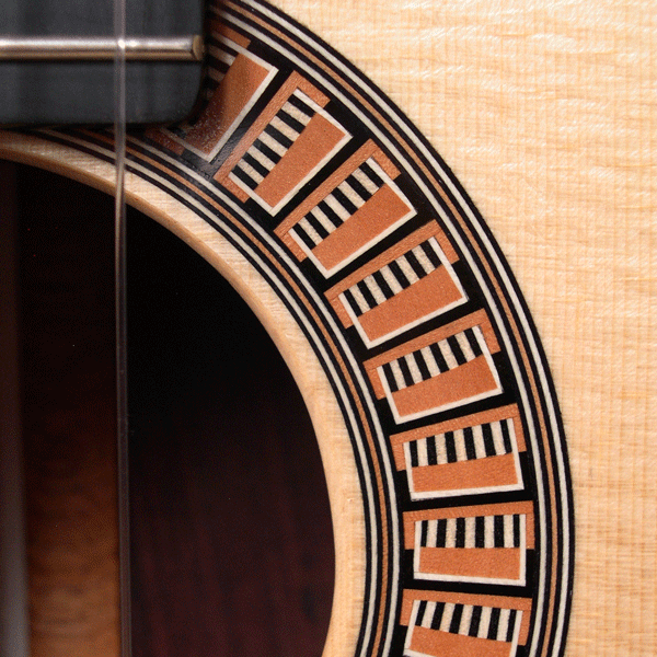 I wanted to have a gallery page specifically for the rosettes that I have designed. Besides finally stringing up the guitar to hear the fruits of my labors, I get most excited about the opportunity to create a unique new design for the ring around the soundhole...the rosette. This definitely adds to the time it takes to complete one of my guitars as 8-10 hours of additional work is not uncommon to design and build the logs required. I have gradually developed techniques to insure more continuous straight lines and I also lay up the logs so that face grain is what is visible in the finished rosette. Though more difficult to assemble because of the fragility of the veneers, face grain exhibits the true color of the wood better while end grain tends to look muddy when finish is applied. Here are a few of my favorites.